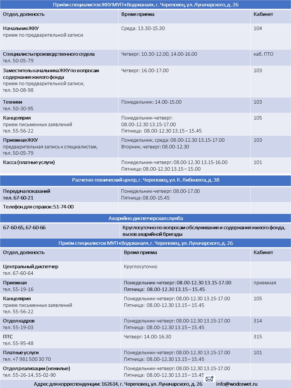 2. Запись на личный прием осуществляется на основании письменного обращения гражданина с изложением сути обращения, которое направляется в канцелярию МУП «Водоканал», удобным для гражданина способом (почтовый адрес: г. Череповец, пр. Луначарского, 26; адрес эл. почты: info@wodoswet или лично).Анонимные обращения не рассматриваются.
